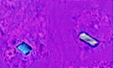 The gold standard of pseudogout diagnosis is presence of CPPD crystals in the fluid from a joint. These crystals are rhomboid-shaped structures that look either blue or red- depending on their orientation- under a polarized microscope. To find these crystals, a sample of the fluid is removed from the joint with a needle and looked at under the microscope.